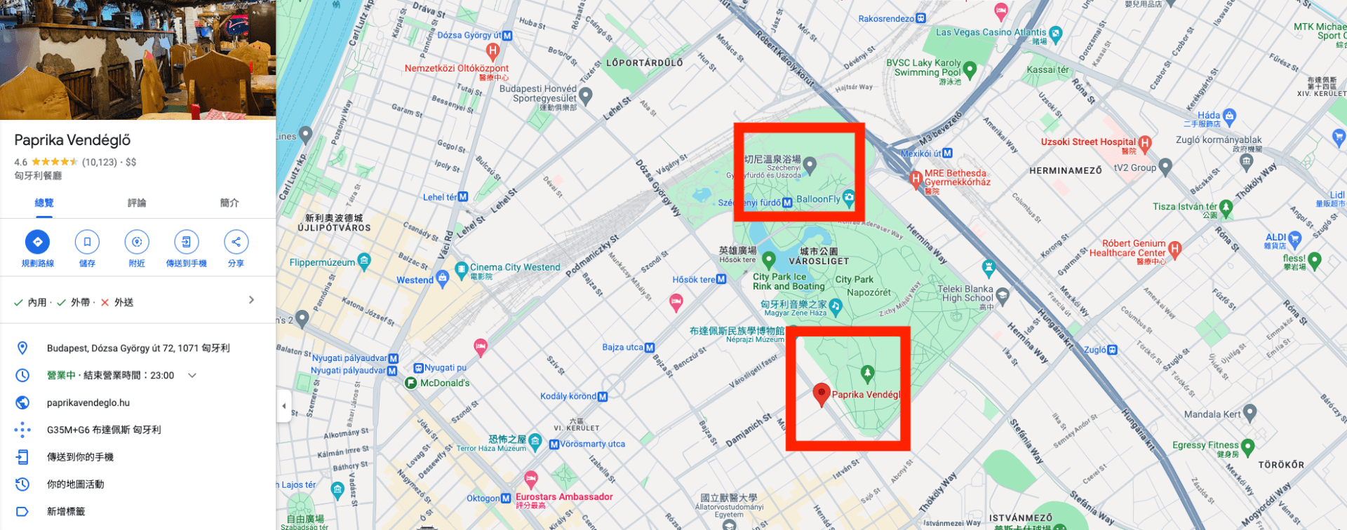Paprika Vendéglő Restaurant 營業時間:12:00-23:00 地點:Budapest, Dózsa György út 72, 1071 匈牙利(Google Map) 預約:+36 (20) 294-79-44 接受電子支付(基本上歐洲都是)