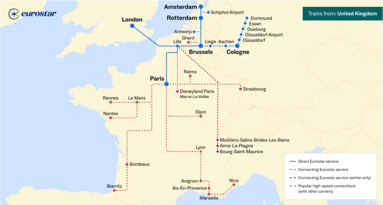 歐洲之星Eurostar是一間在英國、法國、比利時和荷蘭之間的高鐵公司,主要停靠倫敦聖潘克拉斯車站(London St. Pancras International)、法國巴黎北站(Gare du Nord)、里爾(Lille Europe)與比利時布魯塞爾南站(Brussels Zuid / Midi)以及荷蘭鹿特丹(Rotterdam Centrall)、阿姆斯特丹中央車站(Amsterdam Centraal)。