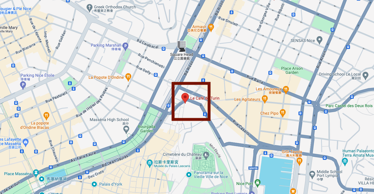 Le Café de Turin 地址:5 Pl. Garibaldi, 06300 Nice(Google Map) 營業時間: 週一至週日 9:00-22:00 電話:+33493622952 官網:點我